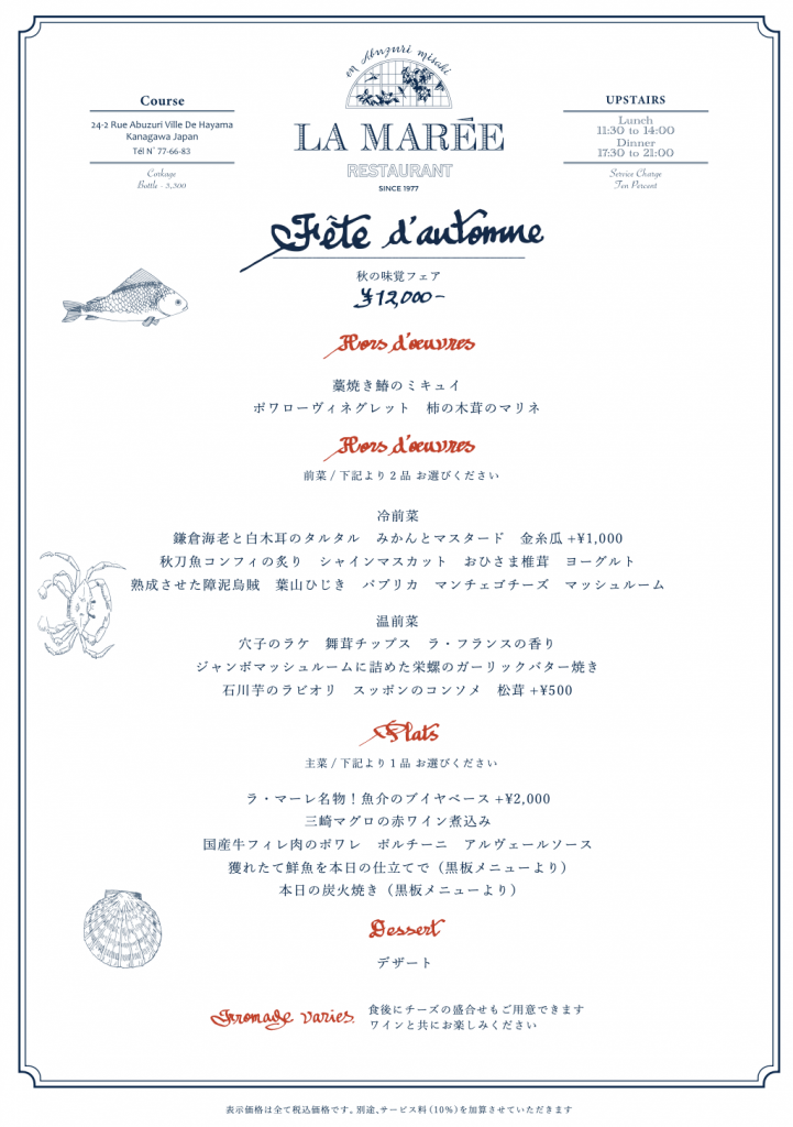 ※表示価格は消費税込み、別途サービス料10%を頂戴いたします。